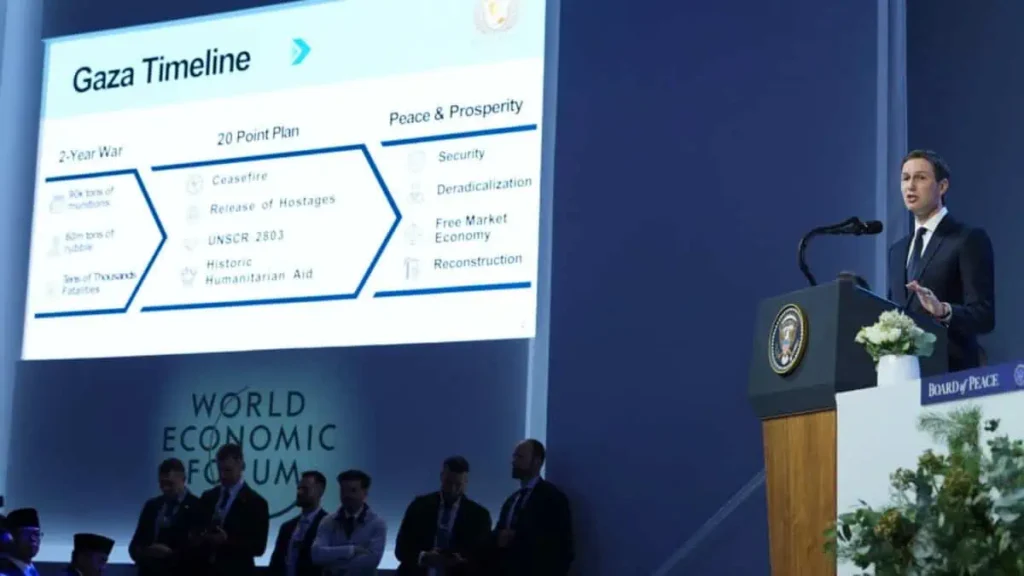 దావోస్: అమెరికా అధ్యక్షుడు ట్రంప్, అతని అల్లుడు, మిడిల్ ఈస్ట్ సలహాదారు జారెడ్ కుష్నర్ దావోస్‌లో జరిగిన వరల్డ్ ఎకనామిక్ ఫోరమ్‌లో “ఫ్రీ మార్కెట్ గాజా” విజన్‌ను ప్రదర్శించారు. ఈ విజువల్స్ రియల్ ఎస్టేట్ బ్రోచర్‌ను పోలి ఉండడంతొ తీవ్ర విమర్శలకు గురయ్యాయి ట్రంప్ “బోర్డ్ ఆఫ్ పీస్” కోసం చార్టర్‌పై సంతకం చేసాక కుష్నర్ మాట్లాడుతూ… ఫ్రీ మార్కెట్ గాజా విజన్‌కు 25 బిలియన్ డాలర్ల పెట్టుబడి అవసమని అన్నారు. ఉద్రిక్తతలను తగ్గించే మార్గాన్ని కనుగొనడానికి […]